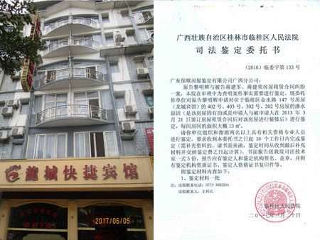 由廣西壯族自治區桂林市臨桂區人民法院審理的黎**與蔣*軍、蔣*榮糾紛一案,因案情需要,受廣西壯族自治區桂林市臨桂區人民法院的委托,廣東保順檢測鑒定有限公司對相關房屋進行鑒定,鑒定事項為對臨桂區金水路**號**賓館402、403、302、202號的滲水原因進行司法鑒定。