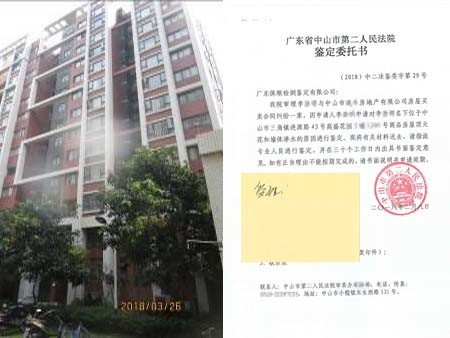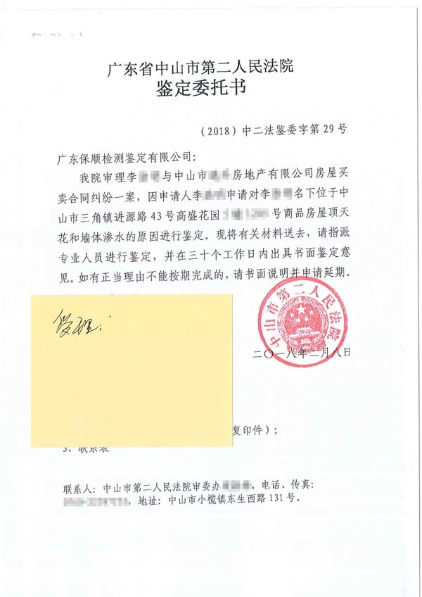 由廣東省中山市第二人民法院審理的原告李**與被告中山市**房地產有限公司房屋買賣合同糾紛一案,因案情需要,受廣東省中山市第二人民法院的委托,我司對李**房屋進行鑒定,鑒定事項為中山市三角鎮進源路43號高盛花園商品房屋頂天花和墻體滲水原因進行鑒定。