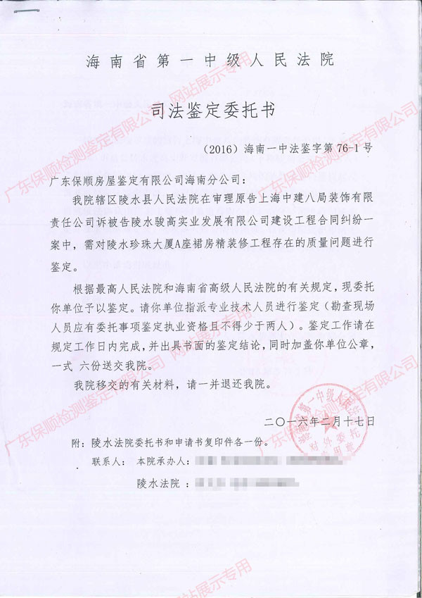 由海南省第一中級人民法院審理的原告上海中建八局裝飾有限責任公司與被告陵水駿高實業發展有限公司建設工程合同糾紛一案,因案情需要,受海南省第一中級人民法院的委托,廣東保順檢測鑒定有限公司對陵水珍珠大廈A座裙房精裝修工程存在的質量問題進行鑒定。