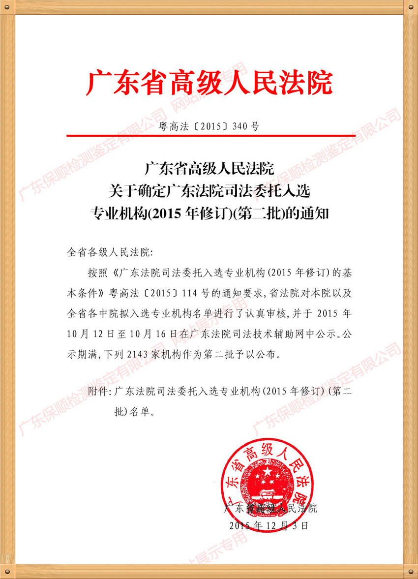 按照《廣東法院司法委托入選專業機構(2015年修訂)的基本條件》粵高法[2015]114號的通知要求,廣東省高級人民法院對本院及全省各中院擬入選專業機構名單進行了認真審核。經過法院審查核實,我司順利入選“廣東省高級人民法院”司法委托專業機構名錄。